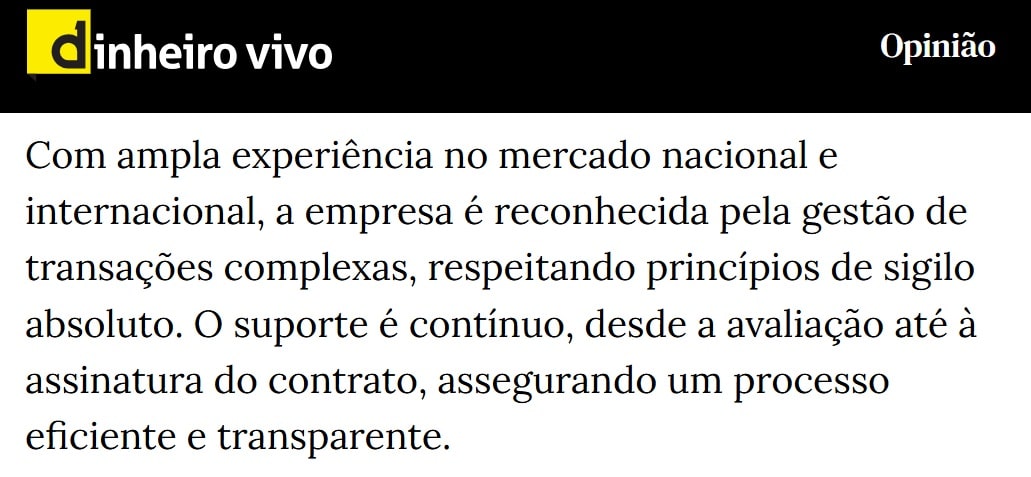 O reconhecimento do Diário de Notícias e do Dinheiro Vivo reflete o impacto real dos nossos serviços na modernização do mercado de transações empresariais, promovendo processos mais transparentes, eficientes e tecnologicamente avançados.