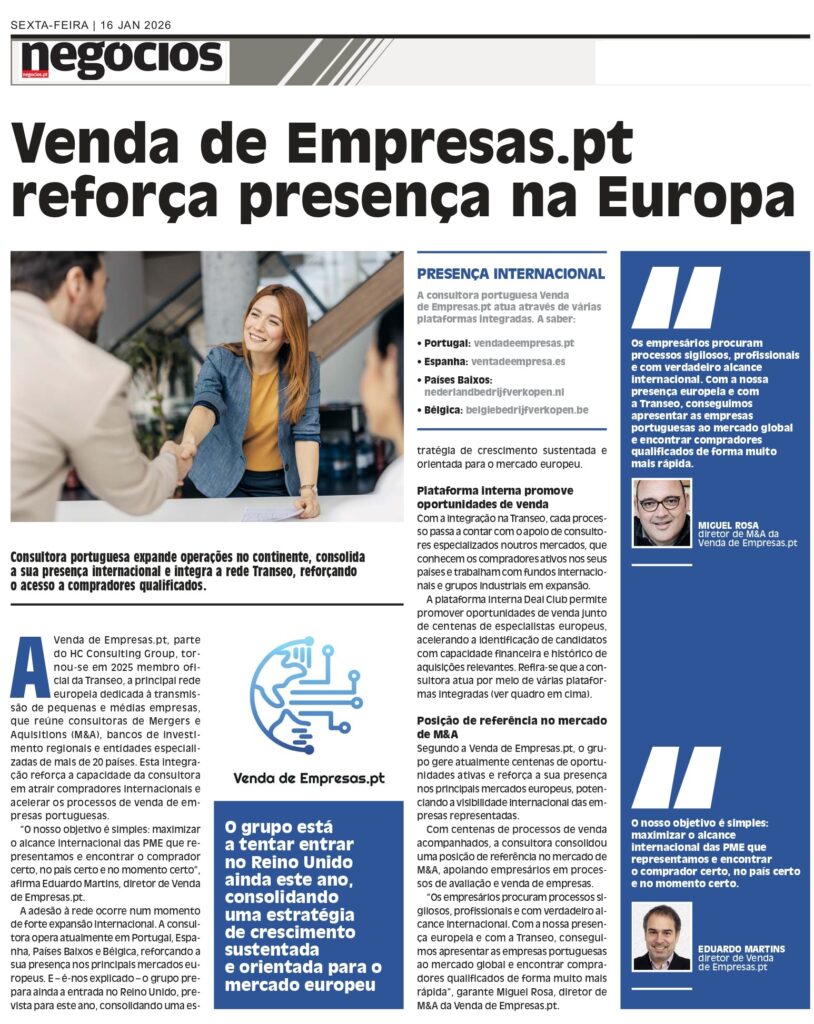Em janeiro de 2026, a Venda de Empresas.pt foi destacada no Jornal de Negócios pela sua estratégia de expansão internacional e integração na rede europeia TRANSEO, reforçando o acesso das PME portuguesas a compradores qualificados em mais de 20 países e consolidando a sua posição como plataforma de referência em processos de M&A em Portugal.